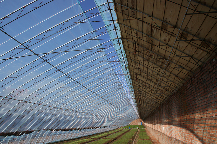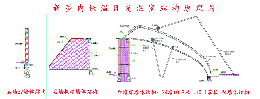 新型內(nèi)保溫日光溫室在光照強(qiáng)度、溫度均高于普通溫室,新型內(nèi)保溫日光溫室具有更好的光照條件和保溫性能,根據(jù)墻體不同可分為:磚夾土型內(nèi)保溫日光溫室、機(jī)建厚墻體型內(nèi)保溫日光溫室、37墻體型內(nèi)保溫日光溫室。針對(duì)北方酷寒氣候條件研發(fā)抗風(fēng)雪型、適合大風(fēng)、寒冷氣候特點(diǎn);主要選擇適合北方可在冬季不加溫的條件下實(shí)現(xiàn)果菜類(lèi)蔬菜生產(chǎn)的新型內(nèi)保溫日光溫室。