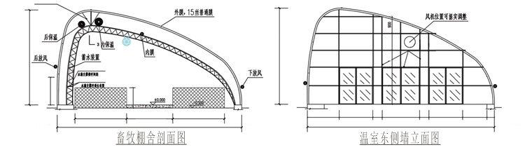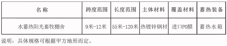水蓄熱陽光畜牧棚舍配套設備包括:棚舍主體、骨架系統、外覆蓋系統、放風系統、內保溫系統、內膜系統、新型蓄熱裝置等。
