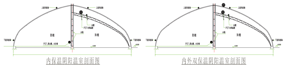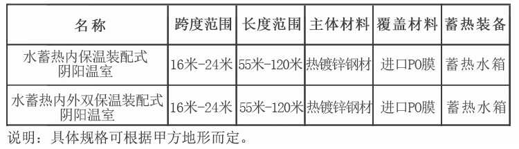 水蓄熱內(nèi)(雙)保溫裝配式陰陽溫室配套設(shè)備包括:溫室主體、骨架系統(tǒng)、(前坡、后坡)外膜系統(tǒng)、(前坡)內(nèi)膜系統(tǒng)、(前后坡上、下)放風(fēng)系統(tǒng)、(前坡)內(nèi)保溫系統(tǒng)、(前坡)外保溫系統(tǒng)、新型水蓄熱系統(tǒng)、安裝系統(tǒng)、供電系統(tǒng)。