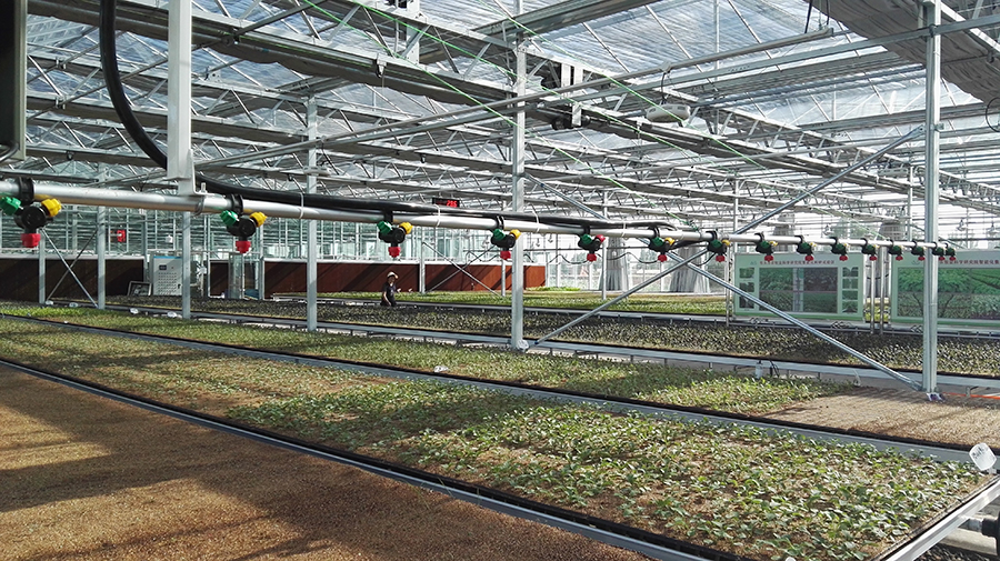 蔬菜集約化育苗裝備及技術(shù)采用配套苗床、軌道式噴灌系統(tǒng)、環(huán)流系統(tǒng)、營養(yǎng)基質(zhì)、補光系統(tǒng)等設(shè)施設(shè)備,并通過嚴格的溫濕光系統(tǒng)環(huán)境控制從而達到育苗生產(chǎn)的標準化、產(chǎn)業(yè)化生產(chǎn)。